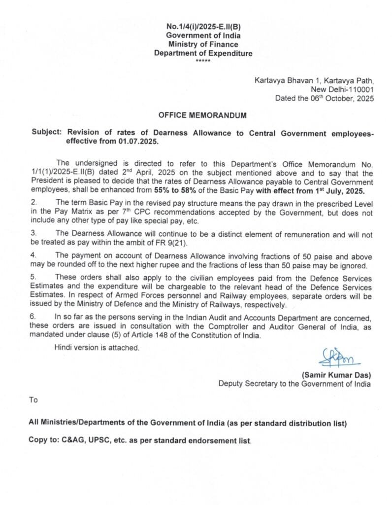 या ‘Office Memorandum’ नुसार, केंद्रीय कर्मचाऱ्यांचा ‘Dearness Allowance’ (DA) चा दर ५५ टक्क्यांवरून वाढवून ५८ टक्के करण्यात आला आहे. म्हणजेच, ‘Basic Pay’ च्या ५८% इतका ‘DA’ आता कर्मचाऱ्यांच्या वेतनात समाविष्ट होईल.