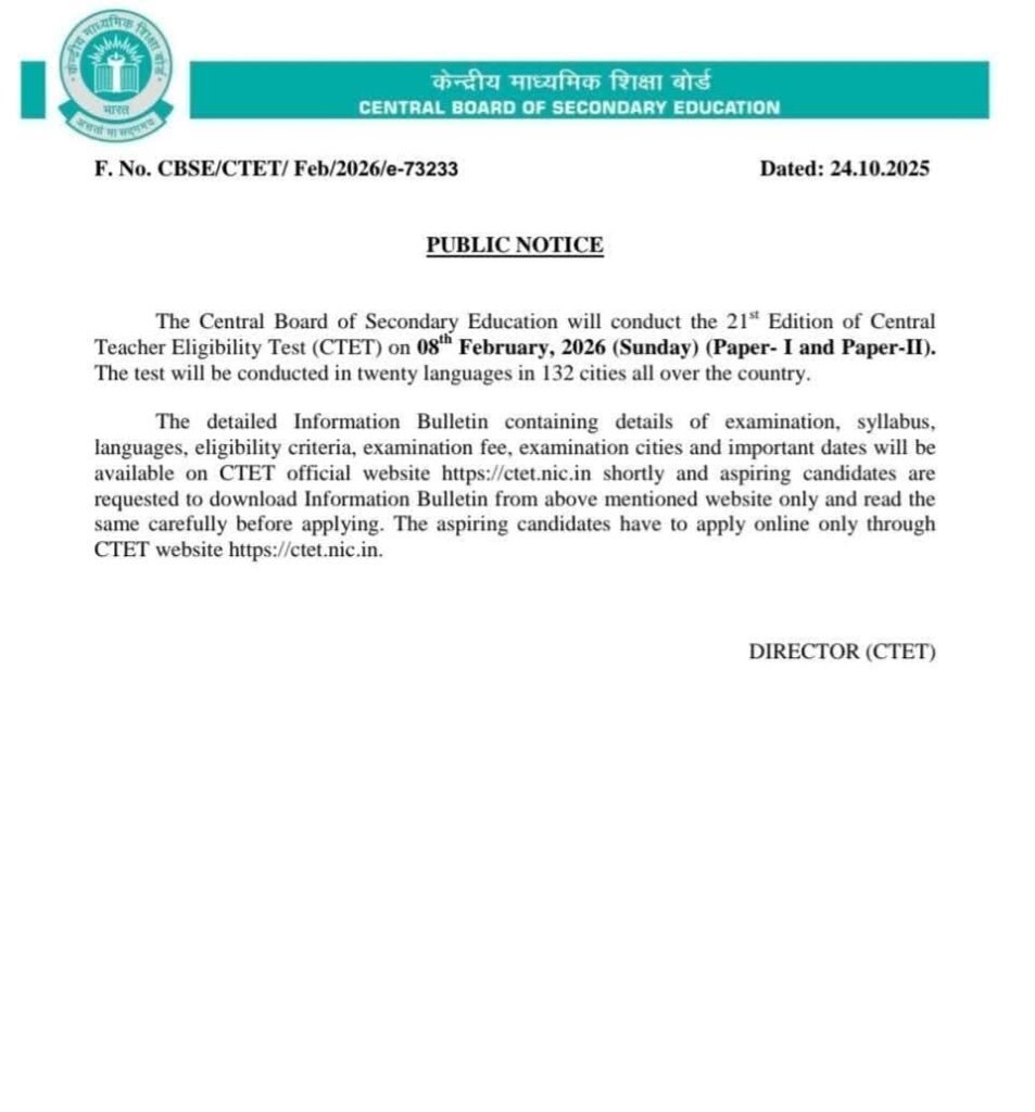 CBSE ने जाहीर केलेल्या माहितीनुसार, CTET Exam Date निश्चित झाली असून, ही परीक्षा ०८ फेब्रुवारी २०२६ (रविवार) रोजी घेतली जाईल. त्यामुळे उमेदवारांना तयारीसाठी आतापासूनच योजना आखता येणार आहे.