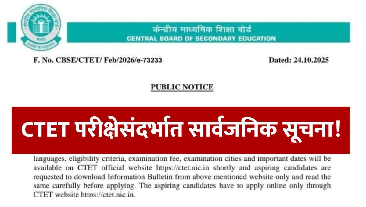 CBSE ने जाहीर केलेल्या माहितीनुसार, CTET Exam Date निश्चित झाली असून, ही परीक्षा ०८ फेब्रुवारी २०२६ (रविवार) रोजी घेतली जाईल. त्यामुळे उमेदवारांना तयारीसाठी आतापासूनच योजना आखता येणार आहे.